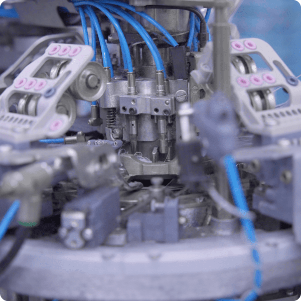 イイダ靴下では、着圧ソックスを生み出すため、たくさんの種類の糸や機械で編み方やつくり方を工夫しています。たとえば、あえてのびない糸を使うことで、足をサポートする力を強め、長い時間動いてもつかれづらいようにしています。