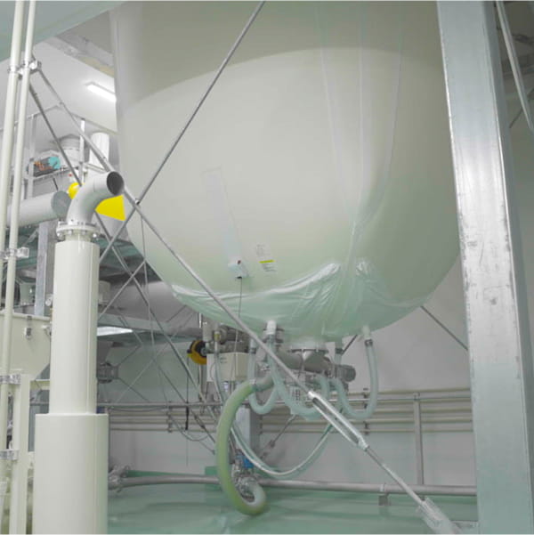 マルタイ佐賀工場では麺の材料になる粉(小麦粉などをブレンドしたもの)は、布製のタンク(サイロ)に貯蔵します。
