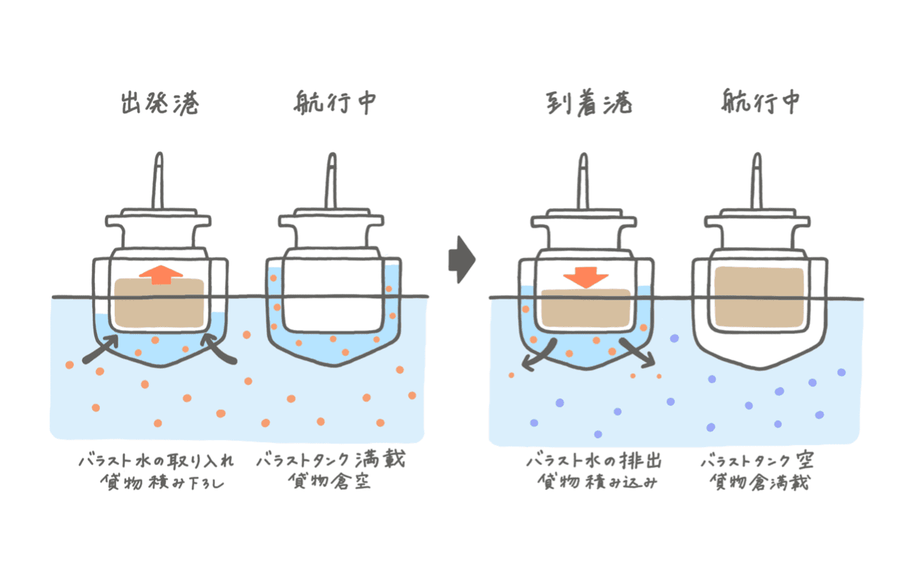 船が海の上で、安全に長い距離を進むために必要なのが「バラスト水」。荷物をのせていない時、船はうきやすく、横からの波や風に対して、とても不安定な状態です。そこで、船を安定させるために、「重し」として船の中に入れるのが「バラスト水」。「バラスト水」は、出発場所の海水を船の中につみこんだものをいいます。目的地の港に到着し、船に荷物をのせるときに、バラスト水は、海に放出されます。
